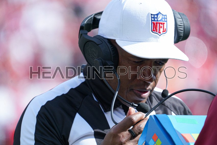 Tampa Bay, Florida, USA, November 10, 2024, Referee Shawn Smith reviewing a play during the San Francisco 49ers vs Tampa Bay Buccaneers game at Raymond James Stadium. (Photo Credit: Marty Jean-Louis)