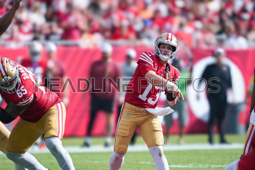 Tampa Bay, Florida, USA, November 10, 2024, San Francisco 49ers quarterback Brock Purdy #13 makes a pass at Raymond James Stadium. (Photo Credit: Marty Jean-Louis)