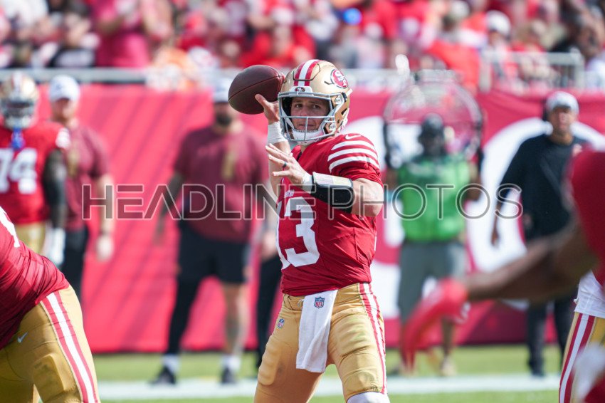Tampa Bay, Florida, USA, November 10, 2024, San Francisco 49ers quarterback Brock Purdy #13 makes a pass at Raymond James Stadium. (Photo Credit: Marty Jean-Louis)