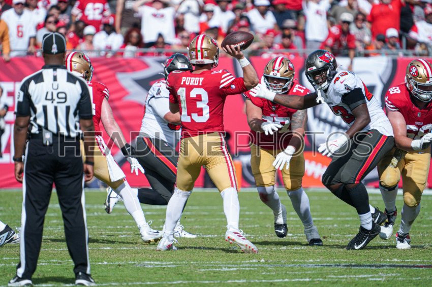 Tampa Bay, Florida, USA, November 10, 2024, San Francisco 49ers quarterback Brock Purdy #13 makes a pass at Raymond James Stadium. (Photo Credit: Marty Jean-Louis)