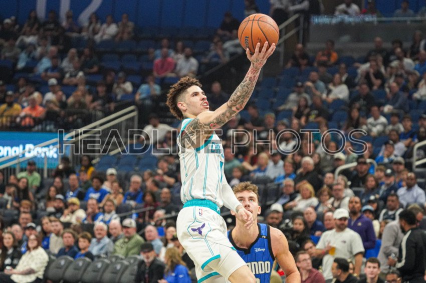 Orlando, Florida, USA, November 12, 2024, Charlotte Hornets guard LaMelo Ball #1 makes a layup at the Kia Center. (Photo Credit: Marty Jean-Louis)