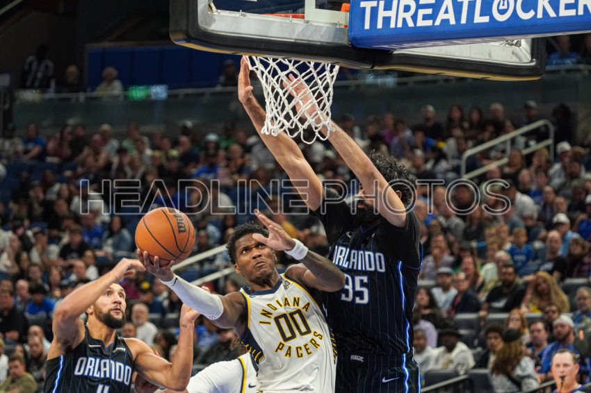 Orlando, Florida, USA, November 13, 2024, Indiana Pacers forward Bennedict Mathurin #00 attempt to score but is fouled by Goga Bitadze #35 at the Kia Center. (Photo Credit: Marty Jean-Louis)