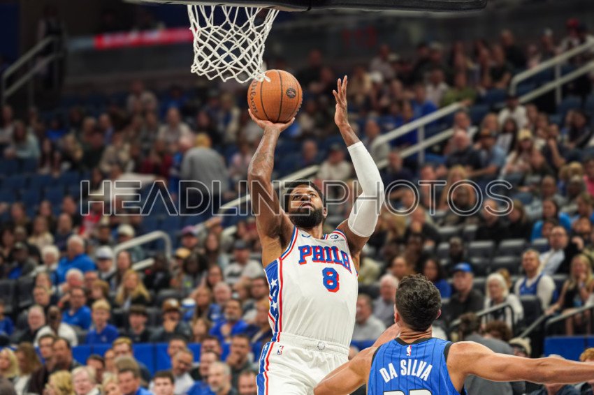 Orlando, Florida, USA, November 15, 2024, Philadelphia 76ers forward Paul George #8 attempt to score during the first half at the Kia Center. (Photo Credit: Marty Jean-Louis)