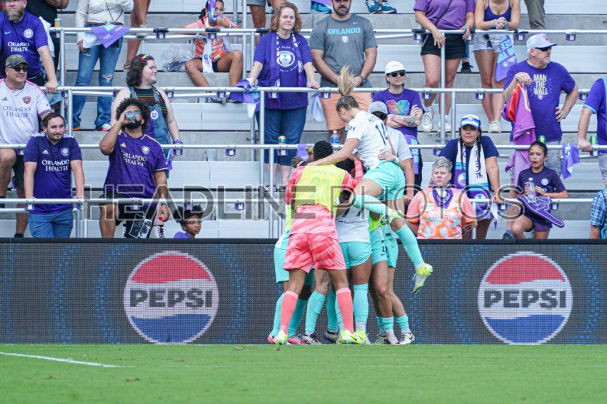 Orlando, Florida, USA, November 17, 2024, Kansas City Current players celebrate first goal of the match at Inter&Co Stadium. (Photo Credit: Marty Jean-Louis)