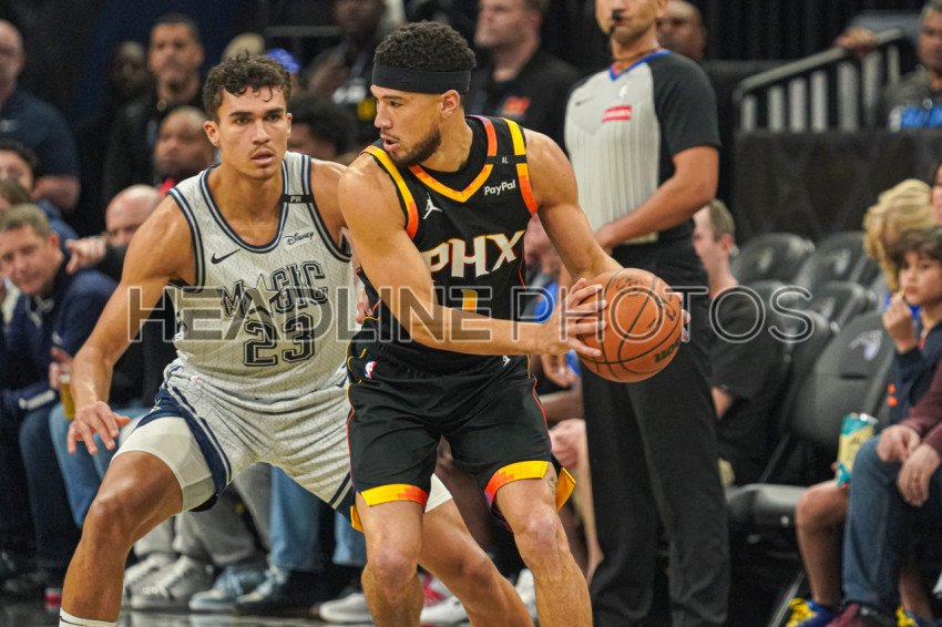Orlando, Florida, USA, December 8, 2024, Phoenix Suns guard Devin Booker #1 guards the ball at the Kia Center. (Photo Credit: Marty Jean-Louis)