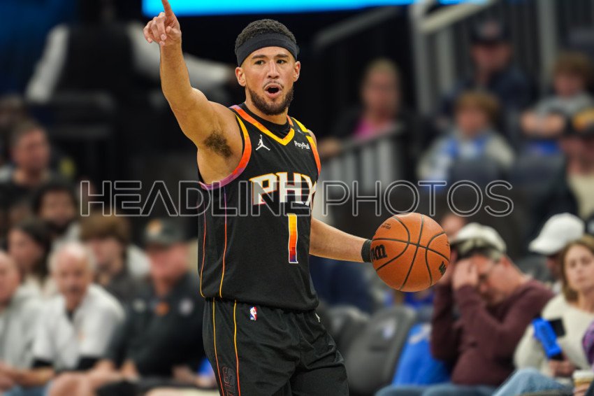 Orlando, Florida, USA, December 8, 2024, Phoenix Suns fguard Devin Booker #21 pushes forward as he points to teammate at the Kia Center. (Photo Credit: Marty Jean-Louis)
