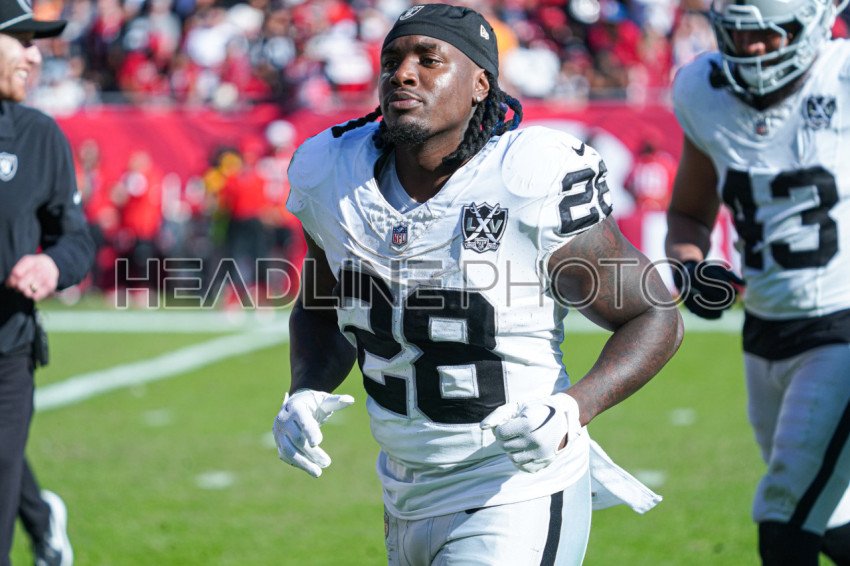 Tampa Bay, Florida, USA, December 8, 2024, Las Vegas Raiders player Sincere McCormick #28 at Raymond James Stadium. (Photo Credit: Marty Jean-Louis)