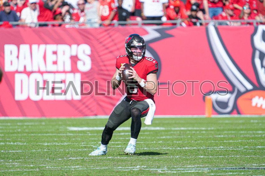 Tampa Bay, Florida, USA, December 8, 2024, Tampa Bay Buccaneers quarterback Baker Mayfield #6 prepares to make a pass at Raymond James Stadium. (Photo Credit: Marty Jean-Louis)
