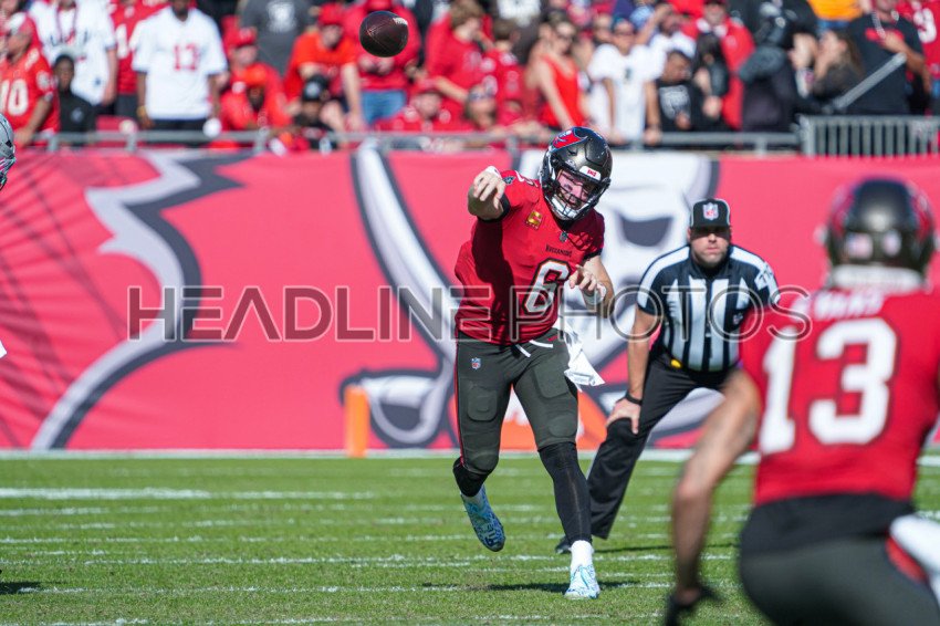 Tampa Bay, Florida, USA, December 8, 2024, Tampa Bay Buccaneers quarterback Baker Mayfield #6 makes a pass at Raymond James Stadium. (Photo Credit: Marty Jean-Louis)