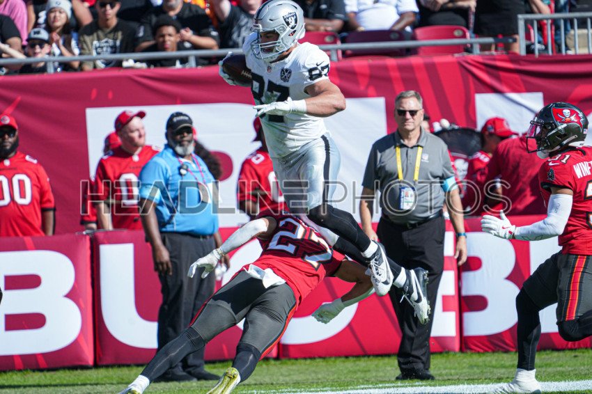 Tampa Bay, Florida, USA, December 8, 2024, Las Vegas Raiders tight end Michael Mayer #87 leaps over Zyon McCollum #27 at Raymond James Stadium. (Photo Credit: Marty Jean-Louis)