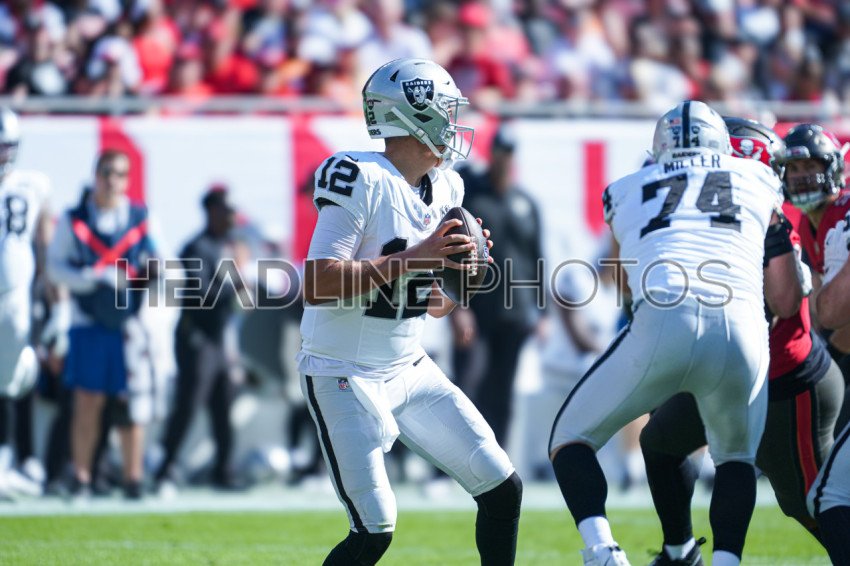Tampa Bay, Florida, USA, December 8, 2024, Las Vegas Raiders quarterback Aidan O'Connel #12 makes a pass at Raymond James Stadium. (Photo Credit: Marty Jean-Louis)
