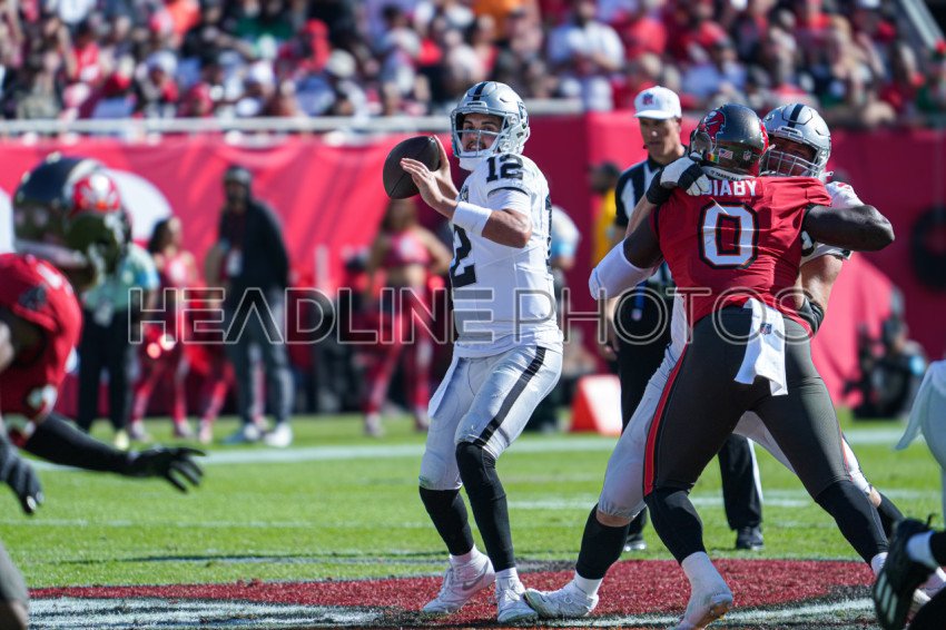 Tampa Bay, Florida, USA, December 8, 2024, Las Vegas Raiders quarterback Aidan O'Connel #12 makes a pass at Raymond James Stadium. (Photo Credit: Marty Jean-Louis)