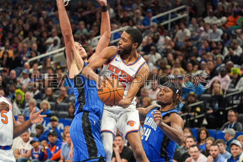 Orlando, Florida, USA, December 27, 2024, New York Knicks guard Mikal Bridges makes a pass under the basket at the Kia Center. (Photo Credit: Marty Jean-Louis)