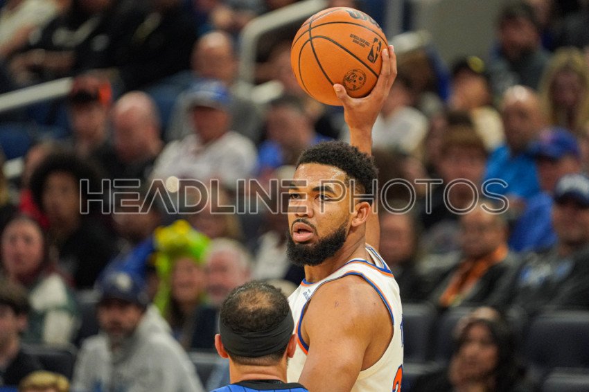 Orlando, Florida, USA, December 27, 2024, New York Knicks center Karl-Anthony Towns #32 defends the ball at the Kia Center. (Photo Credit: Marty Jean-Louis)