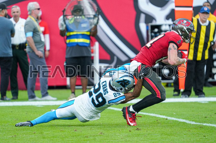 Tampa Bay, Florida, USA, December 29, 2024, Tampa Bay Buccaneers wide receiver Ryan Miller #81 gets tackled by Akayleb Evans #29 at Raymond James Stadium. (Photo Credit: Marty Jean-Louis)
