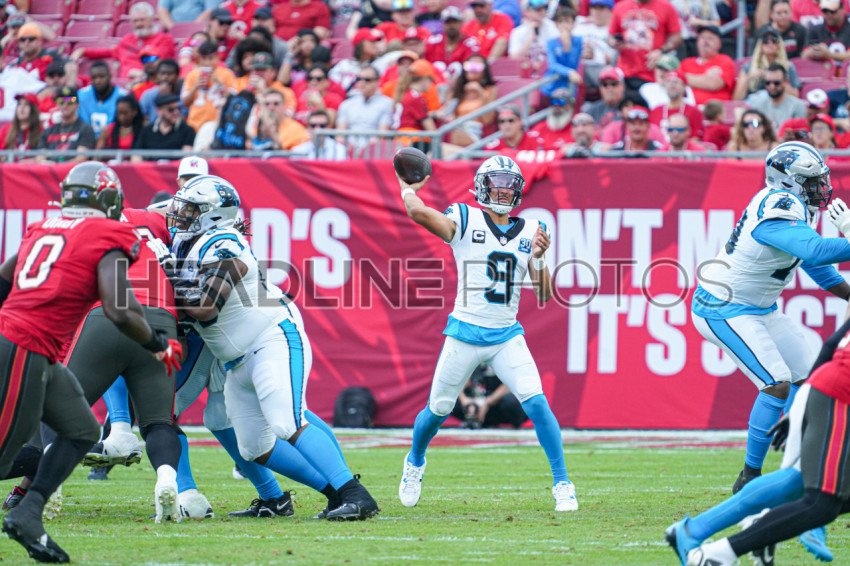 Tampa Bay, Florida, USA, December 29, 2024, Carolina Panthers quarterback Bryce Young #9 makes a pass at Raymond James Stadium. (Photo Credit: Marty Jean-Louis)