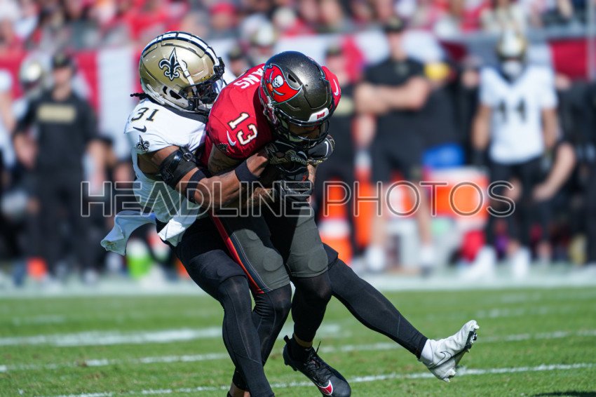 Tampa Bay, Florida, USA, January 5, 2025, Tampa Bay Buccaneers wide receiver Mike Evans #13 is tackled by Jordan Howden #31 at Raymond James Stadium. (Photo Credit: Marty Jean-Louis)