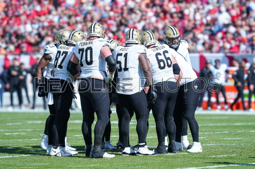 Tampa Bay, Florida, USA, January 5, 2025, New Orleans Saints players huddle during the first quarter at Raymond James Stadium. (Photo Credit: Marty Jean-Louis)