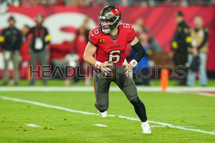 Tampa Bay, Florida, USA, January 12, 2025, Tampa Bay Buccaneers quarterback Baker Mayfield #6 on the run at Raymond James Stadium. (Photo Credit: Marty Jean-Louis)