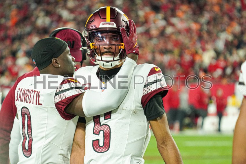 Tampa Bay, Florida, USA, January 12, 2025, Washington Commanders quarterback Jayden Daniels and Mike Sainristil #0 at Raymond James Stadium. (Photo Credit: Marty Jean-Louis)