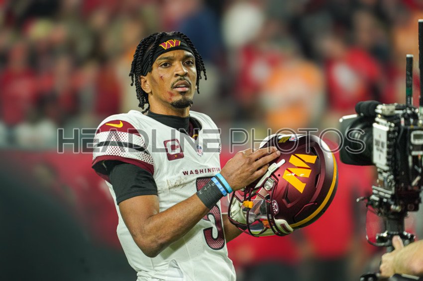 Tampa Bay, Florida, USA, January 12, 2025, Washington Commanders quarterback Jayden Daniels with blood on his face at Raymond James Stadium. (Photo Credit: Marty Jean-Louis)