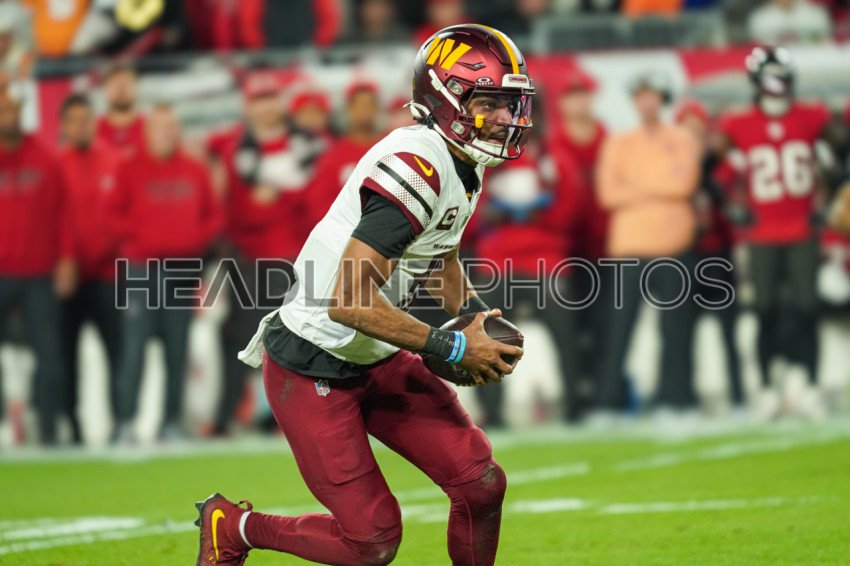 Tampa Bay, Florida, USA, January 12, 2025, Washington Commanders quarterback Jayden Daniels on the run at Raymond James Stadium. (Photo Credit: Marty Jean-Louis)