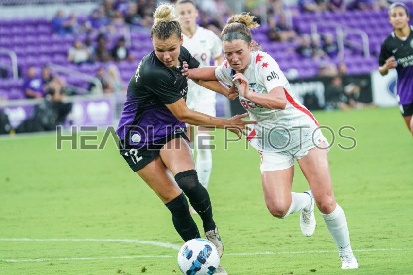 Orlando, Florida, USA, May 22, 2022, Chicago Red Stars player Griffith Sarah #15 and Orlando Pride player Lawrence Carrie #12 fight for the ball at Exploria Stadium. (Photo Credit: Marty Jean-Louis)