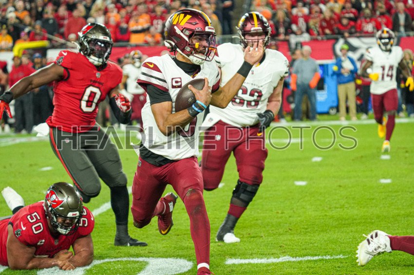 Tampa Bay, Florida, USA, January 12, 2025, Washington Commanders quarterback Jayden Daniels on the run at Raymond James Stadium. (Photo Credit: Marty Jean-Louis)
