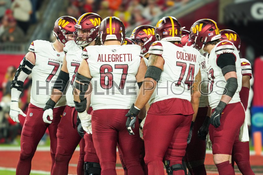 Tampa Bay, Florida, USA, January 12, 2025, Washington Commanders players huddle during the first quarter at Raymond James Stadium. (Photo Credit: Marty Jean-Louis)