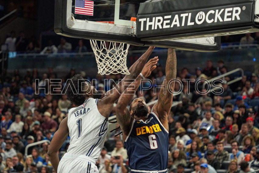 Orlando, Florida, USA, January 19, 2025, Denver Nuggets center DeAndre Jordan #6 attempt to score but is blocked by Jonathan Isaac #1 at the Kia Center. (Photo Credit: Marty Jean-Louis)
