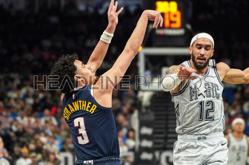 Orlando, Florida, USA, January 19, 2025, Denver Nuggets guard Julian Strawther #3 shoots a three at the Kia Center. (Photo Credit: Marty Jean-Louis)