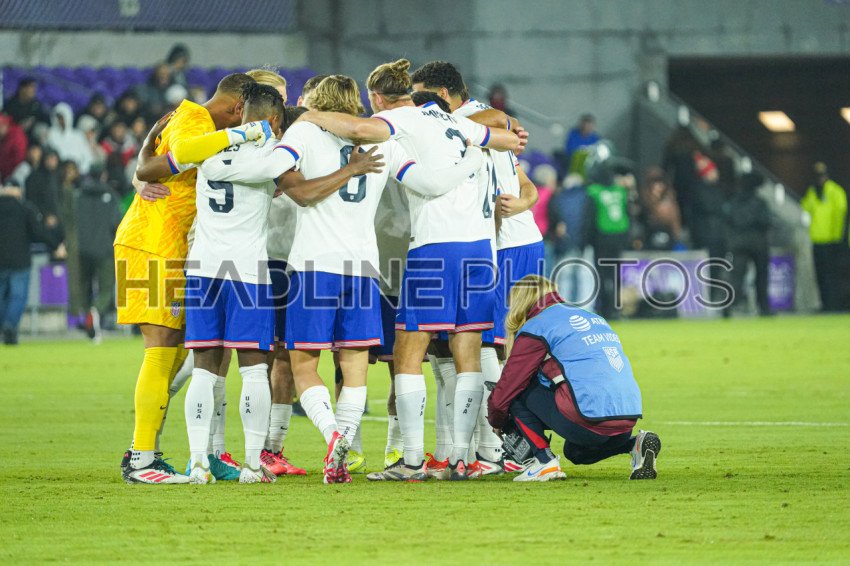 Orlando, Florida, January 22, 2025, USA players huddle before the opening whistle in a Friendly Match at Exploria Stadium. (Photo Credit: Marty Jean-Louis)