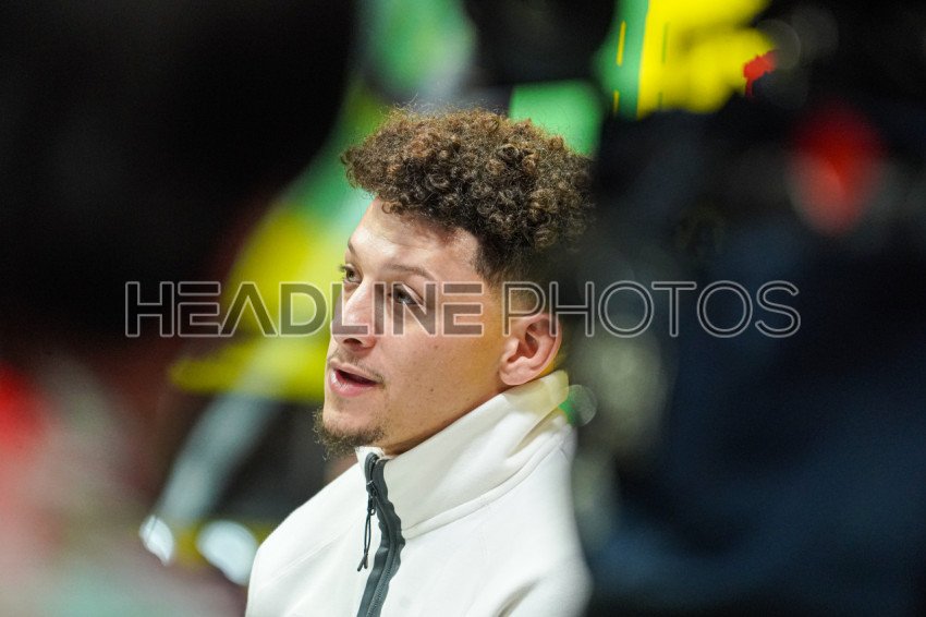 Chiefs Quarterback Patrick Mahomes answering questions from reporters During the Super Bowl LIX (59) Opening Night Ceremony at the Caesars Superdome in New Orleans, Louisiana