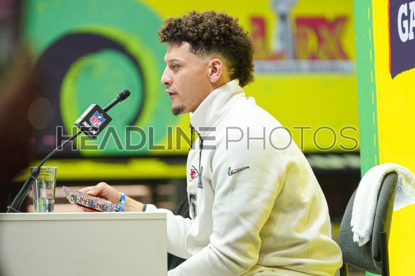 Chiefs Quarterback Patrick Mahomes answering questions from reporters During the Super Bowl LIX (59) Opening Night Ceremony at the Caesars Superdome in New Orleans, Louisiana