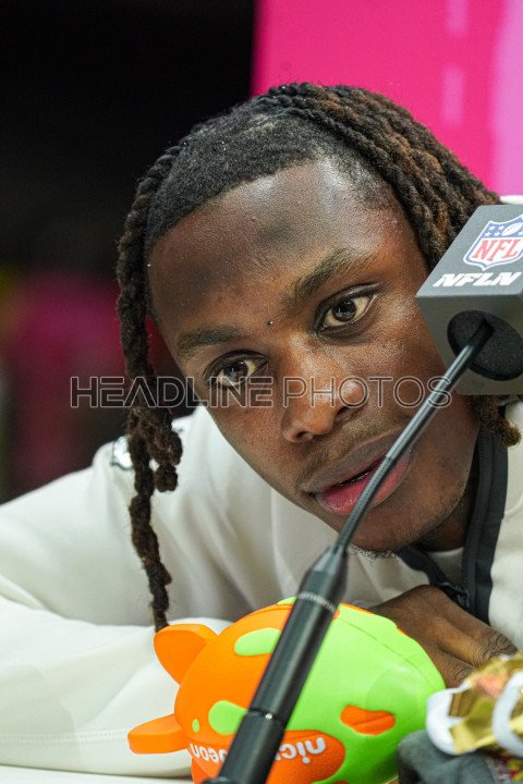 Chiefs player Xavier Worthy answering questions from reporters During the Super Bowl LIX (59) Opening Night Ceremony at the Caesars Superdome in New Orleans, Louisiana