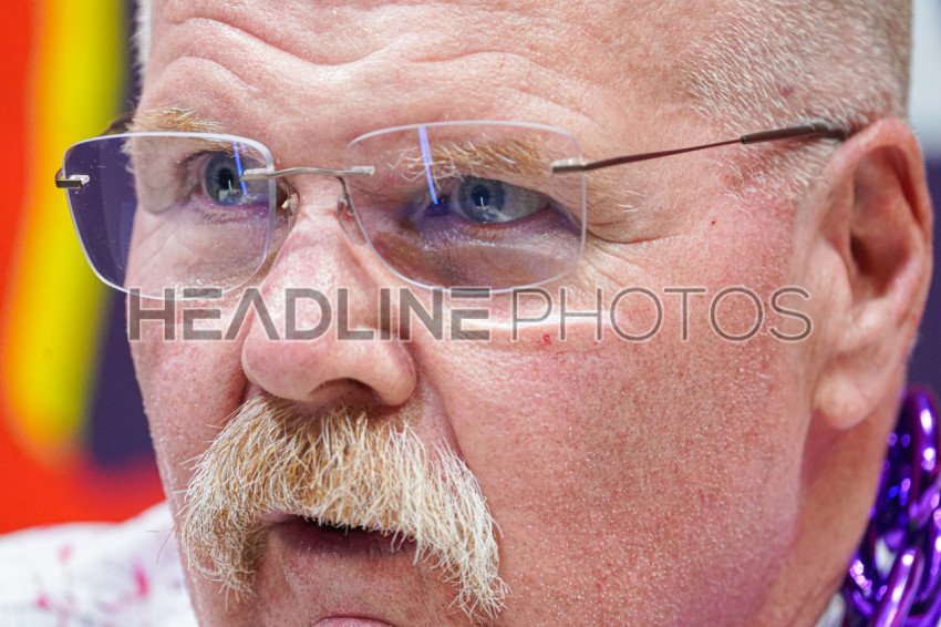 Chiefs head coach Andy Reid answering questions from reporters During the Super Bowl LIX (59) Opening Night Ceremony at the Caesars Superdome in New Orleans, Louisiana