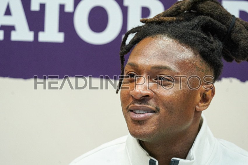 Chiefs player DeAndre Hopkins answering questions from reporters During the Super Bowl LIX (59) Opening Night Ceremony at the Caesars Superdome in New Orleans, Louisiana