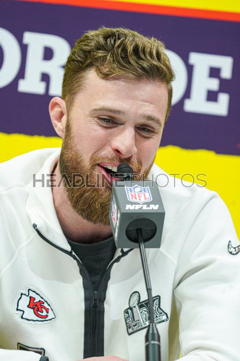 Chiefs player Harrison Butker answering questions from reporters During the Super Bowl LIX (59) Opening Night Ceremony at the Caesars Superdome in New Orleans, Louisiana