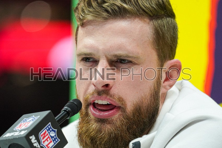 Chiefs player Harrison Butker answering questions from reporters During the Super Bowl LIX (59) Opening Night Ceremony at the Caesars Superdome in New Orleans, Louisiana