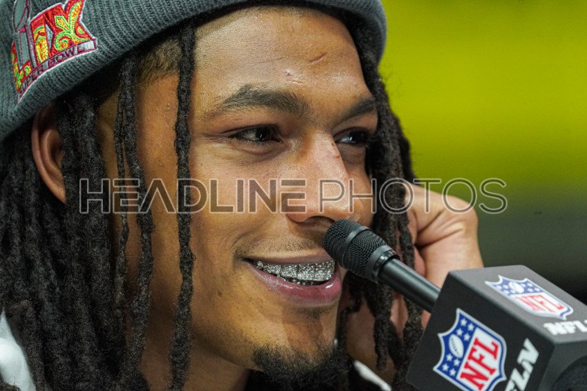 Chiefs player Isiah Pacheco answering questions from reporters During the Super Bowl LIX (59) Opening Night Ceremony at the Caesars Superdome in New Orleans, Louisiana