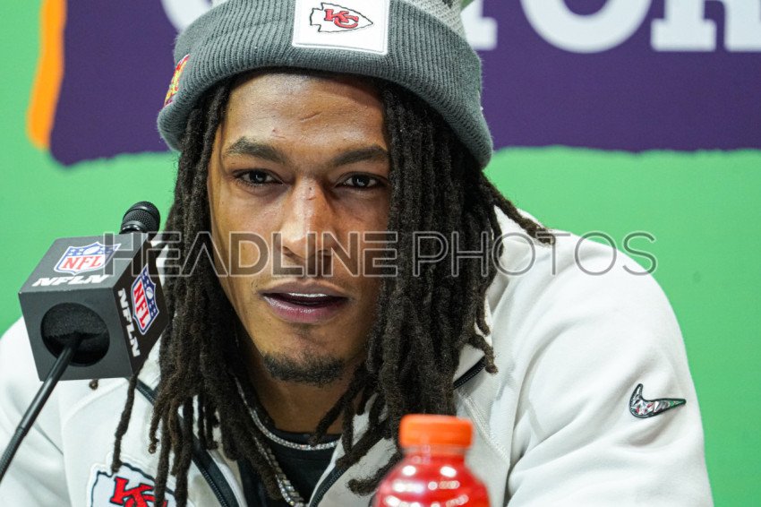 Chiefs player Isiah Pacheco answering questions from reporters During the Super Bowl LIX (59) Opening Night Ceremony at the Caesars Superdome in New Orleans, Louisiana
