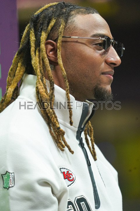 Chiefs player Justin Reid answering questions from reporters During the Super Bowl LIX (59) Opening Night Ceremony at the Caesars Superdome in New Orleans, Louisiana