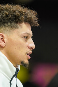 Chiefs Quarterback Patrick Mahomes answering questions from reporters During the Super Bowl LIX (59) Opening Night Ceremony at the Caesars Superdome in New Orleans, Louisiana