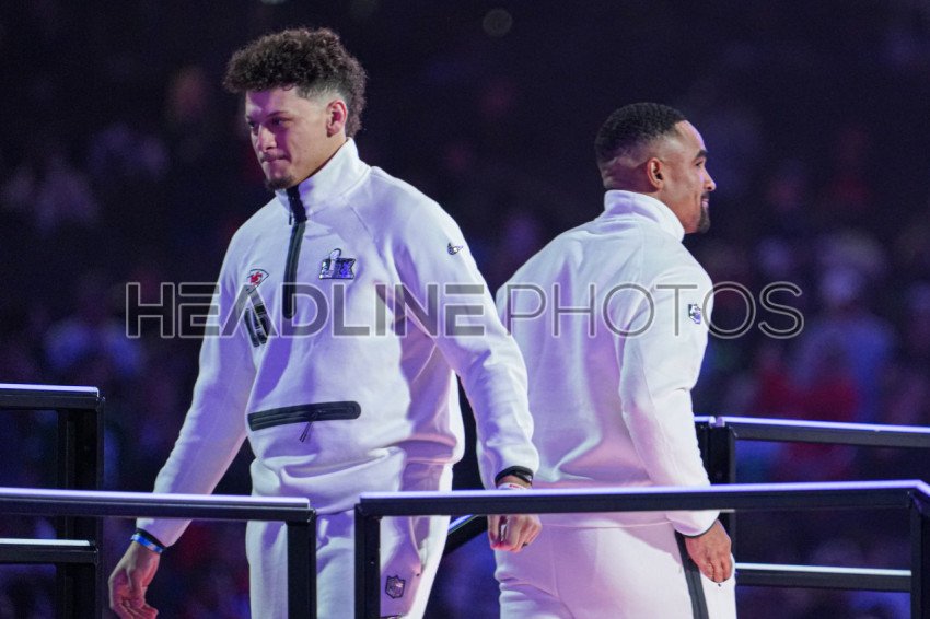 Quarterbacks Jalen Hurts (right) and Patrick Mahomes During the Super Bowl LIX (59) Opening Night Ceremony at the Caesars Superdome in New Orleans, Louisiana