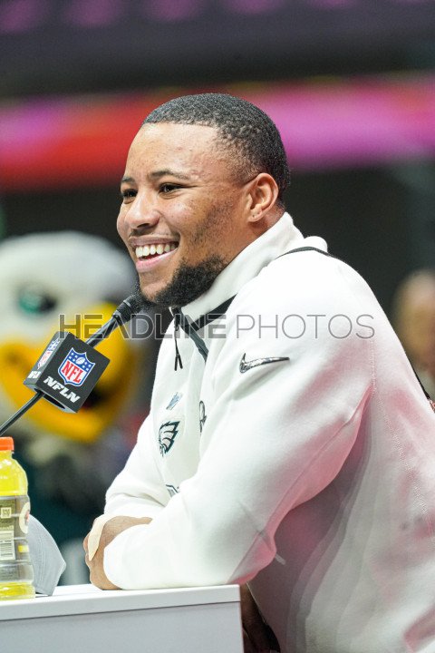Eagles running back Saquan Barkley answering questions from reporters During the Super Bowl LIX (59) Opening Night Ceremony at the Caesars Superdome in New Orleans, Louisiana