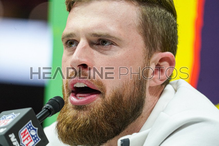 Chiefs player Harrison Butker answering questions from reporters During the Super Bowl LIX (59) Opening Night Ceremony at the Caesars Superdome in New Orleans, Louisiana