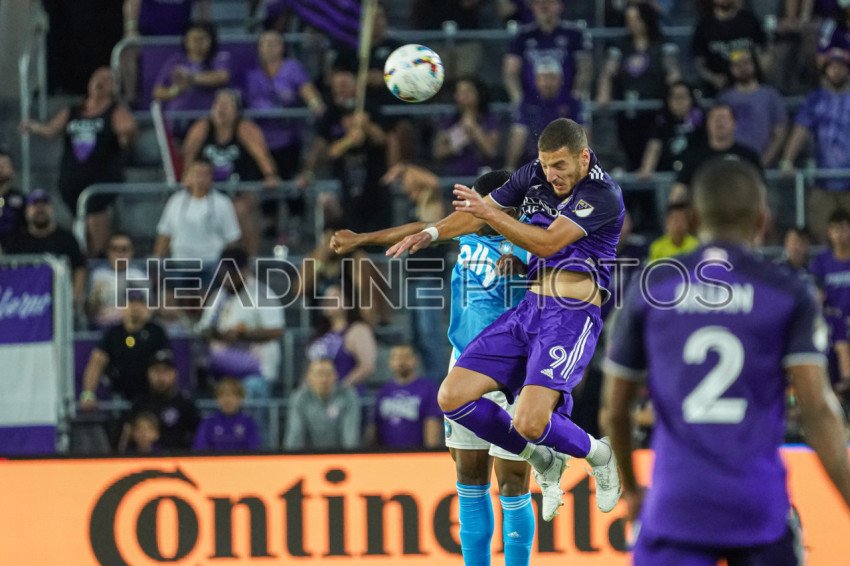 Orlando, Florida, USA, April 30, 2022, Orlando City SC forward Erkan Kara #9 wins the header in the first half at Exploria Stadium. (Photo Credit: Marty Jean-Louis)