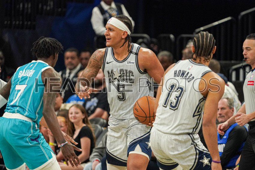 Orlando, Florida, USA, February 12, 2025, Orlando Magic's Paolo Banchero #5 look to make a pass at the Kia Center. (Photo Credit: Marty Jean-Louis)