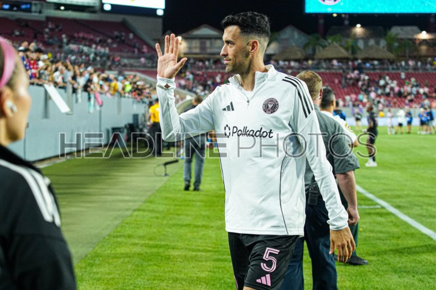 Tampa, Florida, USA, February 14, 2025, Inter Miami midfielder Sergio Busquets #5 waving to fans as he heads to the locker in a friendly Florida Derby Match at Raymond James Stadium. (Photo Credit: Marty Jean-Louis)