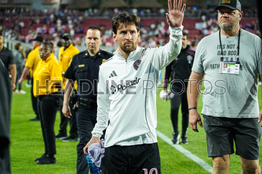 Tampa, Florida, USA, February 14, 2025, Inter Miami players Lionel Messi #10 waving to fans as he heads back to the locker at the end of the match in a friendly Florida Derby Match at Raymond James Stadium. (Photo Credit: Marty Jean-Louis)